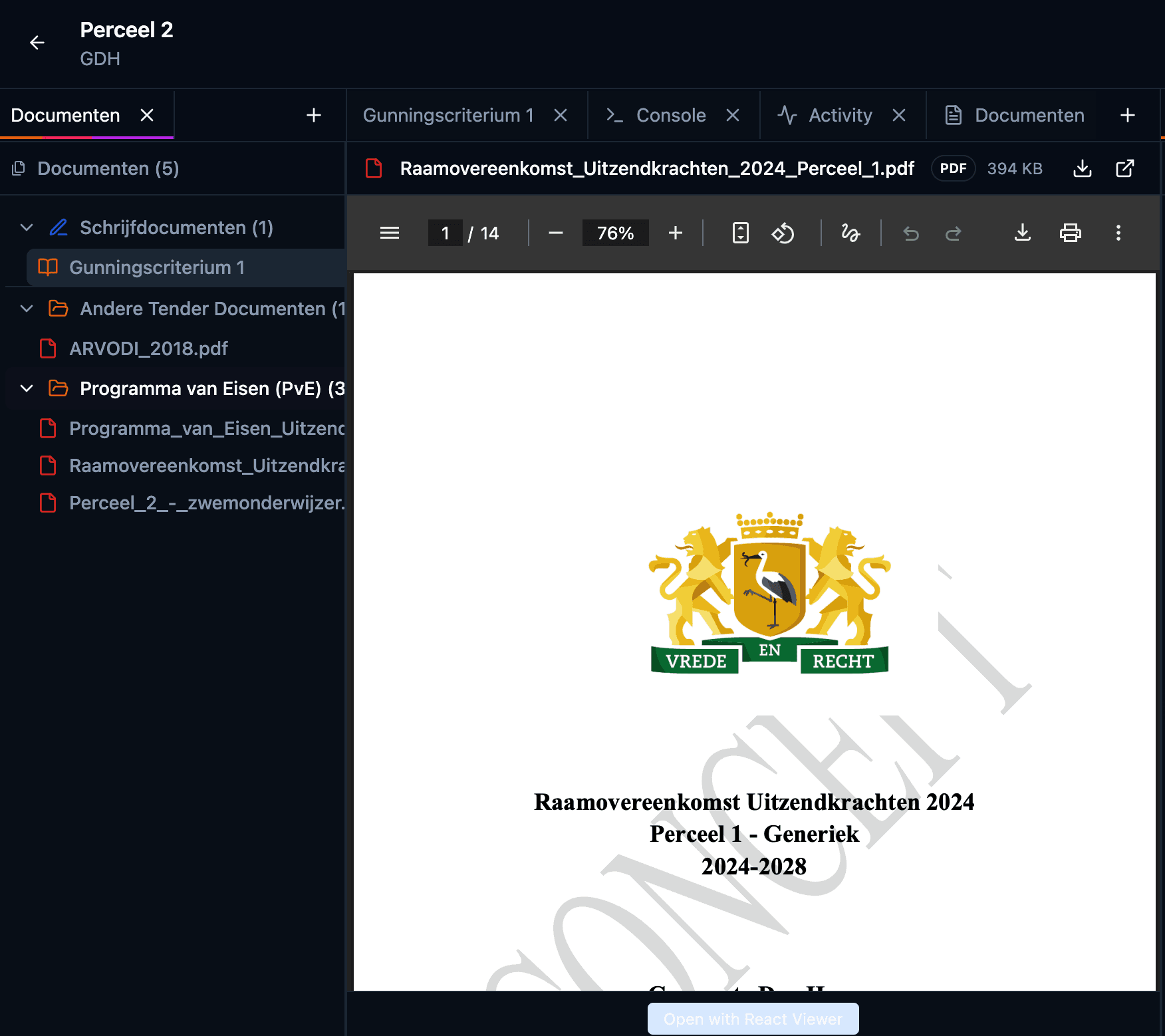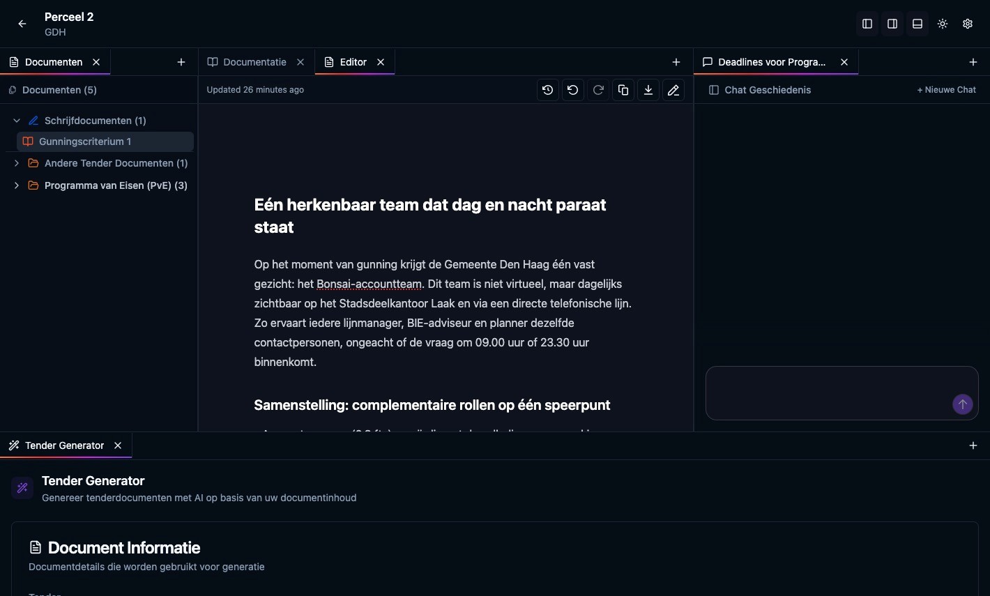 Met ons unieke panelensysteem hoef je nooit meer tussen tools te wisselen. Al je documenten en kennis zijn altijd bij de hand, terwijl je je workspace precies zo inricht als jij wilt. Zo creëer je unieke tenderinschrijvingen in een omgeving die volledig met jou meebeweegt.