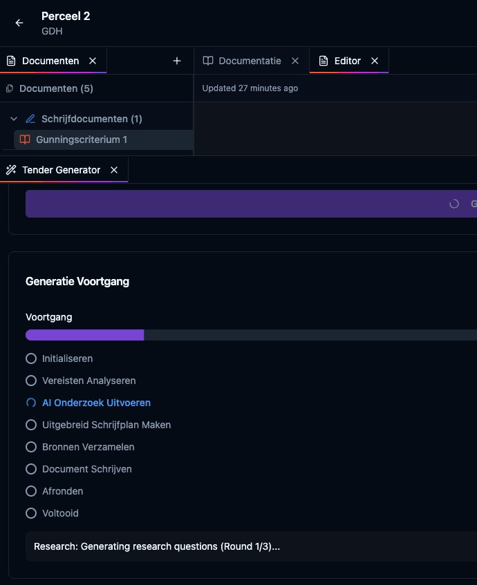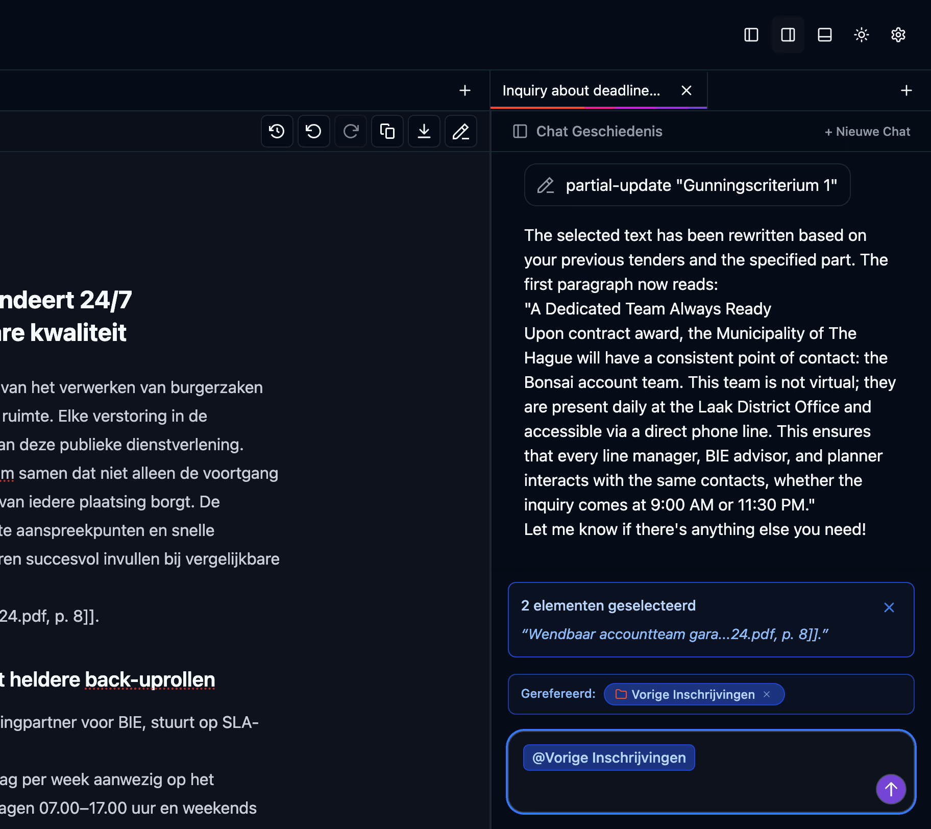We zijn AI first en werken toe naar een complete Agentic ervaring van A–Z voor het winnen van tenders. Dat is onze visie: een digitale collega die het hele tenderproces ondersteunt en aanjaagt, zodat teams minder tijd kwijt zijn aan gedoe en meer impact maken met hun inschrijving.