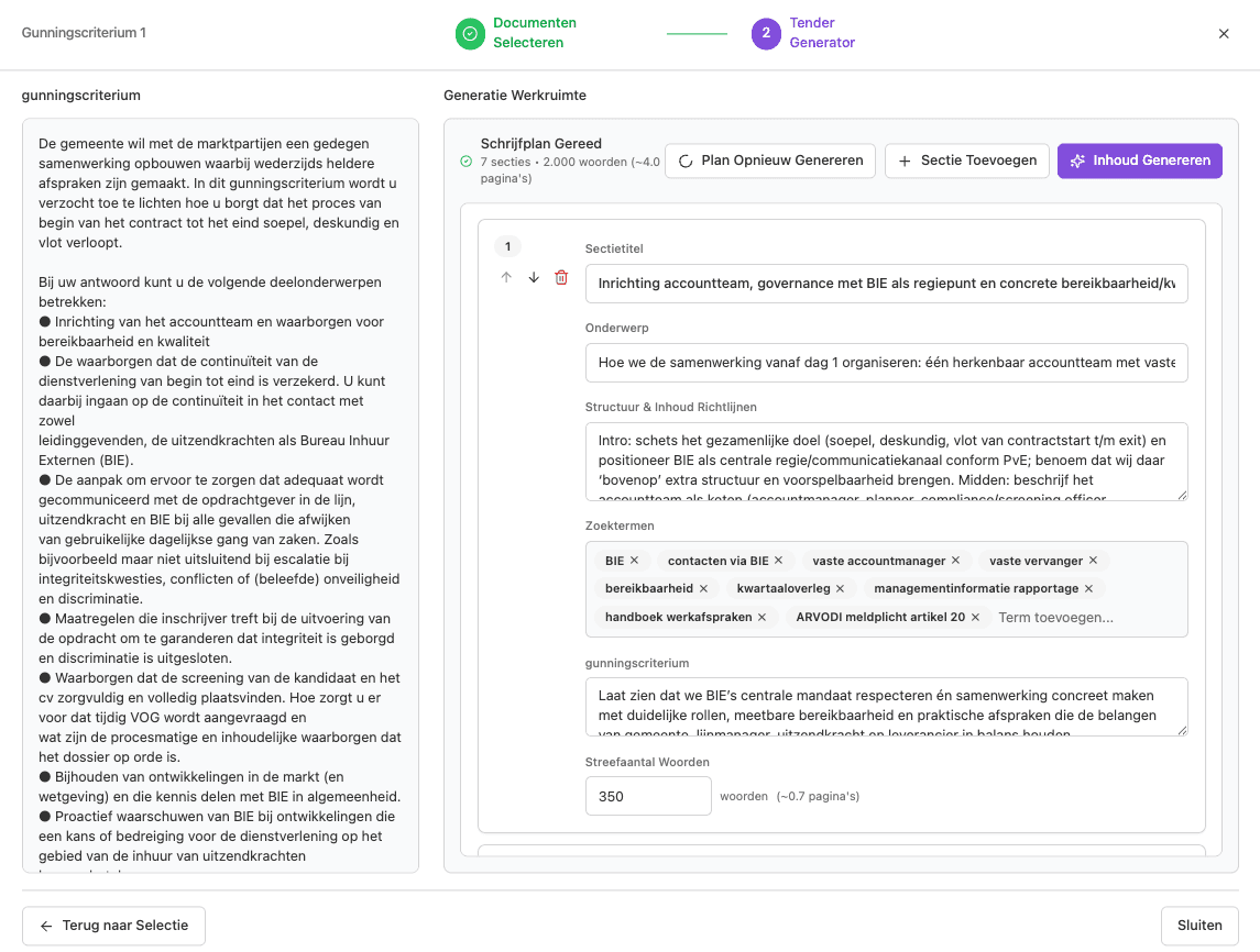 Ons systeem zet alle Agents aan het werk, en gaat met jouw instructies aan de slag om binnen 30 seconden een winnend plan neer te zetten dat aansluit op het te beantwoorden gunningscriterium.