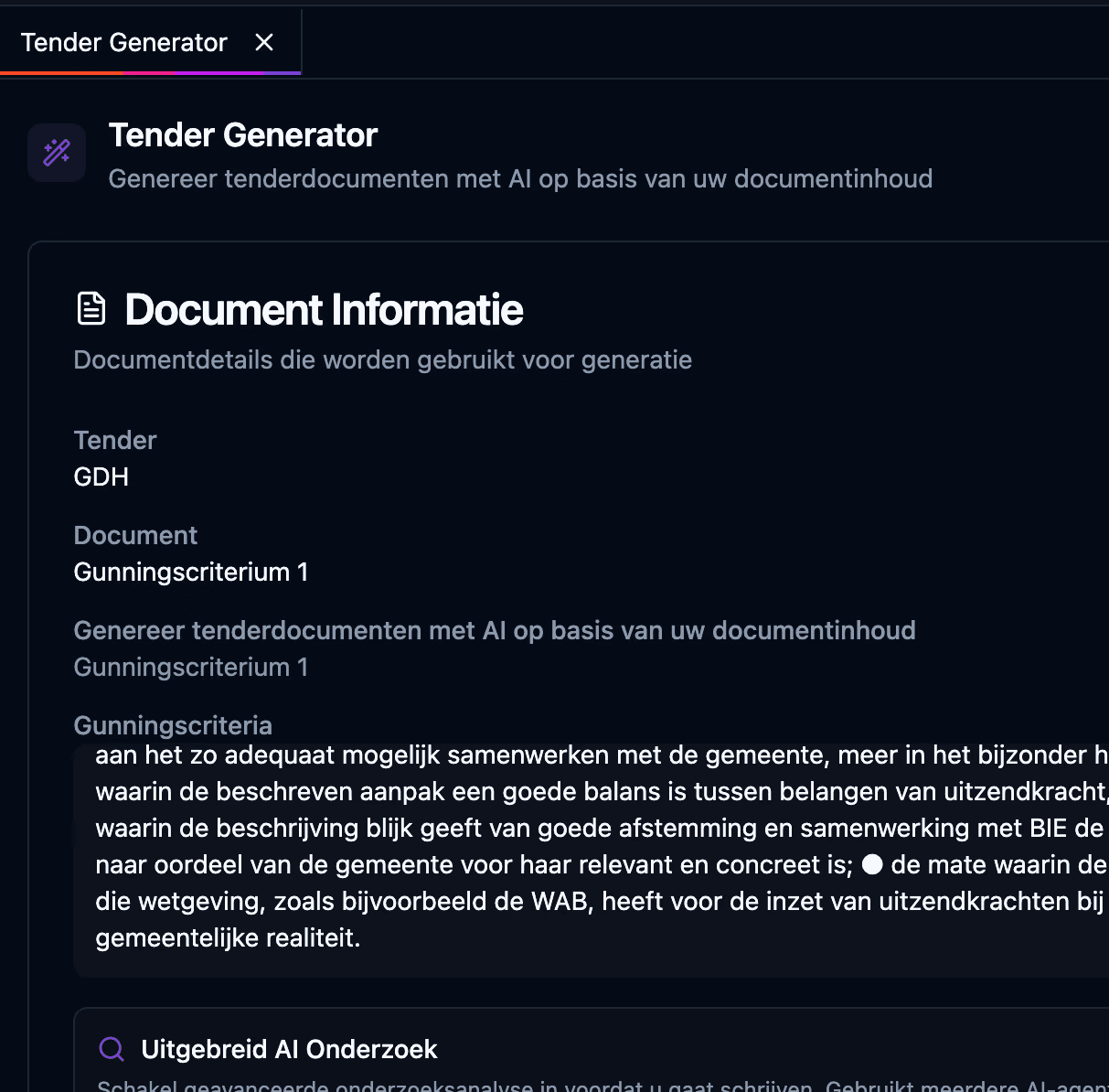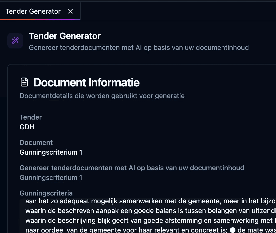 De kern van Tendermate.ai is schrijven: moeiteloos genereren we complete tenders van hoge kwaliteit.